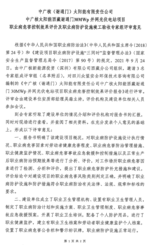 中廣核太陽能西藏謝通門30MWp并網(wǎng)光伏電站項目職業(yè)病危害控制效果評價報告 |