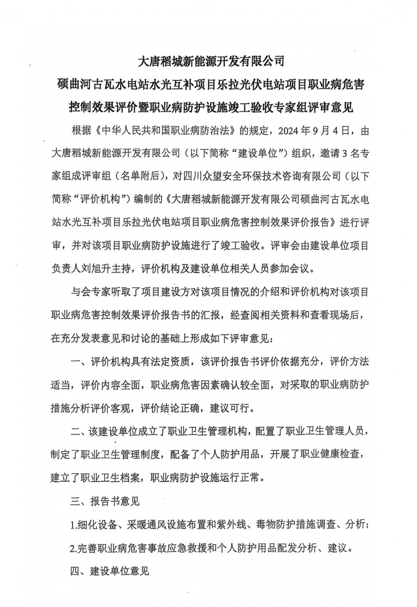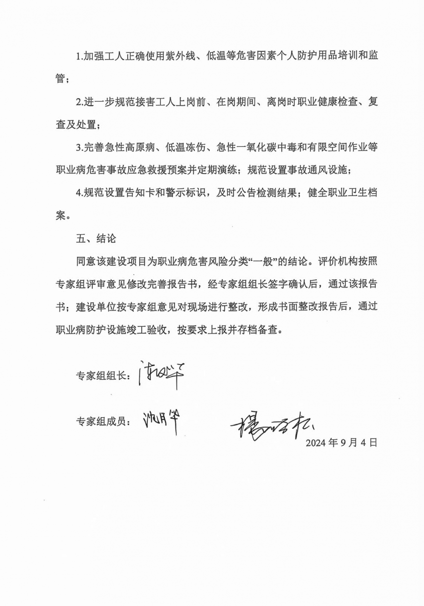 根據(jù)《國(guó)民經(jīng)濟(jì)行業(yè)分類》(GB/T4754-2017),建設(shè)項(xiàng)目屬于“電力、熱力生產(chǎn)和供應(yīng)業(yè)”中的“太陽(yáng)能發(fā)電”,根據(jù)《國(guó)家衛(wèi)生健康委辦公廳關(guān)于公布建設(shè)項(xiàng)目職業(yè)病危害風(fēng)險(xiǎn)分類管理目錄的通知》(國(guó)衛(wèi)辦職健發(fā)〔2021〕5號(hào))的有關(guān)要求,建設(shè)項(xiàng)目職業(yè)病危害風(fēng)險(xiǎn)分類屬于“一般”,結(jié)合建設(shè)項(xiàng)目職業(yè)病危害因素的潛在危險(xiǎn)性、接觸人數(shù)、頻率、時(shí)間、職業(yè)病危害防護(hù)措施和發(fā)生職業(yè)病的危(風(fēng))險(xiǎn)程度等綜合分析,判定該項(xiàng)目職業(yè)病危害一般的建設(shè)項(xiàng)目。 根據(jù)對(duì)本項(xiàng)目現(xiàn)場(chǎng)調(diào)查、職業(yè)病危害因素檢測(cè)結(jié)果和項(xiàng)目相關(guān)資料的綜合分析,本項(xiàng)目職業(yè)衛(wèi)生防治工作符合國(guó)家法律、法規(guī)的相關(guān)規(guī)定,采取的職業(yè)病防治措施基本可行,日常運(yùn)行過(guò)程中在一定程度上能控制和降低職業(yè)病危害因素對(duì)作業(yè)人員健康的影響,項(xiàng)目在落實(shí)了本次評(píng)價(jià)報(bào)告提出的補(bǔ)充措施和建議后,能夠滿足職業(yè)病防治工作的需要。本項(xiàng)目已具備職業(yè)病防護(hù)設(shè)施竣工驗(yàn)收的條件。 建議: (1)建設(shè)單位應(yīng)按照《工作場(chǎng)所職業(yè)衛(wèi)生管理規(guī)定》(中華人民共和國(guó)國(guó)家衛(wèi)生健康委員會(huì)令 第5號(hào))第二十條規(guī)定:職業(yè)病危害一般的用人單位,應(yīng)當(dāng)委托具有相應(yīng)資質(zhì)的職業(yè)衛(wèi)生技術(shù)服務(wù)機(jī)構(gòu),每三年至少進(jìn)行一次職業(yè)病危害因素檢測(cè)。檢測(cè)、評(píng)價(jià)結(jié)果應(yīng)當(dāng)存入本單位職業(yè)衛(wèi)生檔案,并向衛(wèi)生健康主管部門報(bào)告和勞動(dòng)者公布。 (2)建設(shè)單位應(yīng)當(dāng)按照《職業(yè)病危害項(xiàng)目申報(bào)辦法》(國(guó)家安全生產(chǎn)監(jiān)督管理總局令〔2012〕第48號(hào))的規(guī)定,及時(shí)、如實(shí)向所在地衛(wèi)生健康主管部門申報(bào)職業(yè)病危害項(xiàng)目,并接受衛(wèi)生健康主管部門的監(jiān)督檢查。 (3)建設(shè)單位應(yīng)加強(qiáng)職業(yè)衛(wèi)生防護(hù)設(shè)施的管理和維護(hù),定期進(jìn)行檢查、保養(yǎng),并做好相應(yīng)的記錄,定期進(jìn)行防護(hù)效率的檢查,對(duì)不符合要求的進(jìn)行維護(hù)及更新。 (4)用人單位應(yīng)當(dāng)為勞動(dòng)者提供符合國(guó)家標(biāo)準(zhǔn)或者行業(yè)標(biāo)準(zhǔn)的勞動(dòng)防護(hù)用品。使用進(jìn)口的勞動(dòng)防護(hù)用品,其防護(hù)性能不得低于我國(guó)相關(guān)標(biāo)準(zhǔn)。 (5)勞動(dòng)者在作業(yè)過(guò)程中,應(yīng)當(dāng)按照規(guī)章制度和勞動(dòng)防護(hù)用品使用規(guī)則,正確佩戴和使用勞動(dòng)防護(hù)用品。 (6)建設(shè)單位應(yīng)加強(qiáng)作業(yè)人員個(gè)人防護(hù)用品佩戴監(jiān)管,確保作業(yè)人員正確有效佩戴個(gè)人防護(hù)用品。 (7)本項(xiàng)目應(yīng)加強(qiáng)女工的勞動(dòng)保護(hù),建設(shè)單位不得安排孕期、哺乳期的女職工從事對(duì)本人和胎兒、嬰兒有危害的作業(yè)。 (8)建設(shè)單位主要負(fù)責(zé)人和職業(yè)衛(wèi)生管理人員應(yīng)當(dāng)具備與本單位所從事的生產(chǎn)經(jīng)營(yíng)活動(dòng)相適應(yīng)的職業(yè)衛(wèi)生知識(shí)和管理能力,并接受職業(yè)衛(wèi)生培訓(xùn)。 (9)對(duì)接觸職業(yè)病危害因素的運(yùn)維崗應(yīng)按照《職業(yè)健康監(jiān)護(hù)技術(shù)規(guī)范》(GBZ188-2014)的規(guī)定,定期組織到有資質(zhì)的單位進(jìn)行職業(yè)健康體檢,體檢項(xiàng)目應(yīng)包括本項(xiàng)目主要職業(yè)病危害因素所對(duì)應(yīng)的體檢項(xiàng)目,并建立職業(yè)健康監(jiān)護(hù)檔案。 (10)上崗前健康檢查的主要目的是發(fā)現(xiàn)有無(wú)職業(yè)禁忌證,建立接觸職業(yè)病危害因素人員的基礎(chǔ)健康檔案。上崗前健康檢查均為強(qiáng)制性職業(yè)健康檢查,應(yīng)在開始從事有害作業(yè)前完成。下列人員應(yīng)進(jìn)行上崗前健康檢查:a)擬從事接觸職業(yè)病危害因素作業(yè)的新錄用人員,包括轉(zhuǎn)崗到該種作業(yè)崗位的人員;b)擬從事有特殊健康要求作業(yè)的人員,如高處作業(yè)、電工作業(yè)、職業(yè)機(jī)動(dòng)車駕駛作業(yè)等。 勞動(dòng)者在準(zhǔn)備調(diào)離或脫離所從事的職業(yè)病危害作業(yè)或崗位前,應(yīng)進(jìn)行離崗時(shí)健康檢查;主要目的是確定其在停止接觸職業(yè)病危害因素時(shí)的健康狀況。如最后一次在崗期間的健康檢查是在離崗前的90d內(nèi),可視為離崗時(shí)檢查。 (11)針對(duì)生產(chǎn)環(huán)境中存在紫外線和低溫危害,建議補(bǔ)充當(dāng)心紫外線、注意低溫警示標(biāo)識(shí)。 |