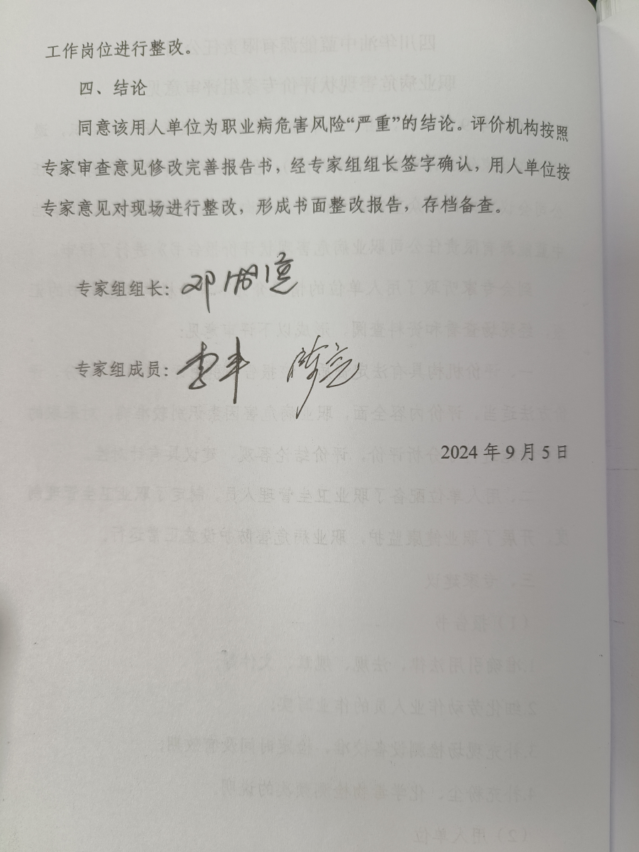 (2)建議用人單位應(yīng)嚴(yán)格執(zhí)行上崗前、在崗期間、離崗時的職業(yè)體檢制度,依據(jù)《職業(yè)健康監(jiān)護(hù)技術(shù)規(guī)范》(GBZ188-2014)的相關(guān)要求組織體檢,體檢結(jié)果應(yīng)書面告知員工,體檢結(jié)果有異常的,須及時進(jìn)行復(fù)查,復(fù)查結(jié)果仍然有異常的須按規(guī)定進(jìn)行診療,并做妥善安排。 (3)對準(zhǔn)備脫離所從事的職業(yè)病危害作業(yè)或者崗位的勞動者,用人單位應(yīng)當(dāng)在勞動者離崗前30日內(nèi)組織勞動者進(jìn)行離崗時的職業(yè)健康檢查。勞動者離崗前90日內(nèi)的在崗期間的職業(yè)健康檢查可以視為離崗時的職業(yè)健康檢查。對需要復(fù)查的勞動者,用人單位應(yīng)當(dāng)按照職業(yè)健康檢查機(jī)構(gòu)要求的時間安排復(fù)查和醫(yī)學(xué)觀察;不得安排有職業(yè)禁忌的勞動者從事其所禁忌的作業(yè),應(yīng)當(dāng)調(diào)離原工作崗位,并妥善安置。用人單位對未進(jìn)行離崗時職業(yè)健康檢查的勞動者,不得解除或者終止與其訂立的勞動合同。 (4)建議用人單位根據(jù)《職業(yè)健康監(jiān)護(hù)技術(shù)規(guī)范》(GBZ188-2014)要求,組織接觸職業(yè)病危害的作業(yè)人員到具有資質(zhì)的醫(yī)療衛(wèi)生機(jī)構(gòu)參加體檢,體檢項目應(yīng)按照崗位接觸的職業(yè)病危害因素進(jìn)行。 (5)建議用人單位外委人員所在單位根據(jù)《中華人民共和國職業(yè)病防治法》與《職業(yè)健康監(jiān)護(hù)技術(shù)規(guī)范》(GBZ188-2014)的要求,嚴(yán)格執(zhí)行上崗前、在崗期間、離崗時的職業(yè)體檢制度。依據(jù)外委人員在用人單位從事的工種崗位,組織所有接觸職業(yè)病危害的外委人員到具有資質(zhì)的醫(yī)療衛(wèi)生機(jī)構(gòu)參加體檢,體檢項目應(yīng)按照崗位接觸的職業(yè)病危害因素進(jìn)行。 4職業(yè)衛(wèi)生管理 (1)依據(jù)《工作場所職業(yè)衛(wèi)生管理規(guī)定》(中華人民共和國國家衛(wèi)生健康委員會令[2020]第5號)第二十條規(guī)定:職業(yè)病危害嚴(yán)重的用人單位,應(yīng)當(dāng)委托具有相應(yīng)資質(zhì)的職業(yè)衛(wèi)生技術(shù)服務(wù)機(jī)構(gòu),每年至少進(jìn)行一次職業(yè)病危害因素檢測。每三年至少進(jìn)行一次職業(yè)病危害現(xiàn)狀評價。檢測、評價結(jié)果應(yīng)當(dāng)存入本單位職業(yè)衛(wèi)生檔案,并向衛(wèi)生主管部門報告和勞動者公布。 (2)用人單位不得將產(chǎn)生職業(yè)危害的作業(yè)轉(zhuǎn)移給不具備職業(yè)病防護(hù)條件的單位和個人。不具備職業(yè)病防護(hù)條件的單位和個人不得接受產(chǎn)生職業(yè)病危害的作業(yè)。 (3)用人單位與勞動者訂立勞動合同(含聘用合同)時,應(yīng)當(dāng)將作業(yè)過程中可能產(chǎn)生的職業(yè)病危害及其后果、職業(yè)病防護(hù)措施和待遇如實告知勞動者,并在勞動合同中寫明,不得隱瞞或者欺騙。 勞動者在履行勞動合同期間因工作崗位或者工作內(nèi)容變更,從事與所訂立的勞動合同中未告知的存在的職業(yè)病危害的作業(yè)時,用人單位應(yīng)當(dāng)依照前款規(guī)定,向勞動者履行如實告知義務(wù),并協(xié)商變更勞動合同相關(guān)條款。 (4)本次職業(yè)病危害現(xiàn)狀評價,只針對此次調(diào)查及檢測過程中的生產(chǎn)狀況,公司今后的生產(chǎn)狀況如果發(fā)生改變,導(dǎo)致職業(yè)病危害因素變化或增加時,應(yīng)及時進(jìn)行職業(yè)病危害因素申報及評價。 |