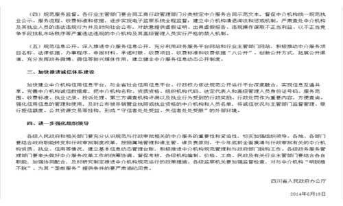 (三)規(guī)范執(zhí)業(yè)行為。有條件的地方可搭建中介集中服務(wù)平臺,按照公平公開原則,將與行政審批直接相關(guān)的檢驗、檢測、認(rèn)證、鑒定、評估、規(guī)劃設(shè)計等中介機(jī)構(gòu)納入平臺規(guī)范運(yùn)行并實行動態(tài)調(diào)整,供企業(yè)和公眾自主選擇。納入平臺的中介服務(wù)事項要統(tǒng)一管理,規(guī)范執(zhí)業(yè)行為,全面推行中介服務(wù)公開承諾制、執(zhí)業(yè)公示制、限時辦結(jié)制、合同管理制、收費公開制、執(zhí)業(yè)記錄制等。