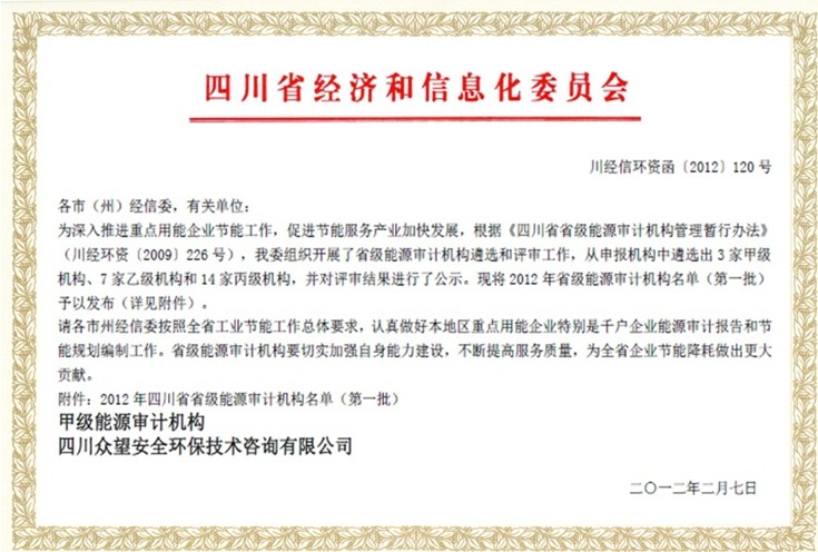 2012年,本公司由四川省經(jīng)濟(jì)和信息化委員會(huì)確定為甲級(jí)能源審計(jì)機(jī)構(gòu),在四川省內(nèi),各個(gè)行業(yè)的高能耗企業(yè)都屬于本公司的業(yè)務(wù)范圍?,F(xiàn)有注冊(cè)能源審計(jì)師10人,先后為100余家企業(yè)提供了專業(yè)的能源審計(jì)和節(jié)能規(guī)劃,為四川省節(jié)能降耗做出了相應(yīng)的貢獻(xiàn)。