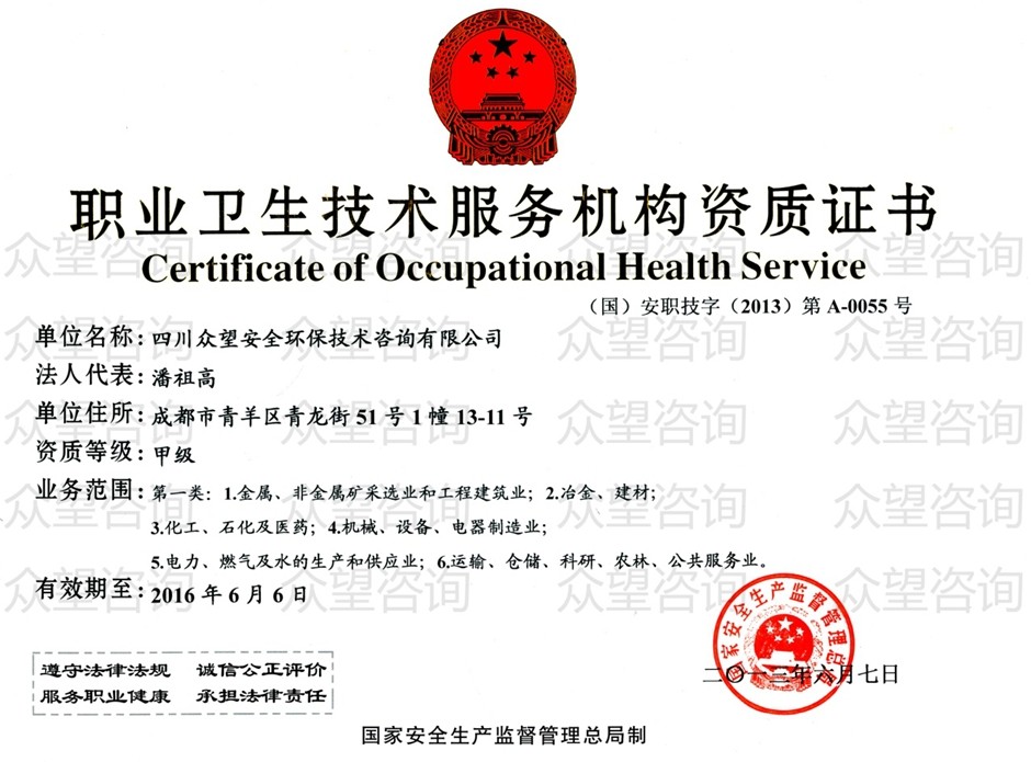 四川眾望自2010年取得職業(yè)衛(wèi)生技術(shù)服務(wù)機(jī)構(gòu)乙級(jí)資質(zhì)起即開始從事職業(yè)衛(wèi)生服務(wù)工作,于2013年6月7日取得職業(yè)衛(wèi)生技術(shù)服務(wù)機(jī)構(gòu)甲級(jí)資質(zhì)。在秉承“責(zé)任 規(guī)范 誠信 真相”的工作準(zhǔn)則下,眾望迄今已順利完成1300余項(xiàng)建設(shè)項(xiàng)目職業(yè)病危害因素日常檢測(cè)、職業(yè)病危害預(yù)評(píng)價(jià)、職業(yè)病危害控制效果評(píng)價(jià)及職業(yè)病危害現(xiàn)狀評(píng)價(jià)。