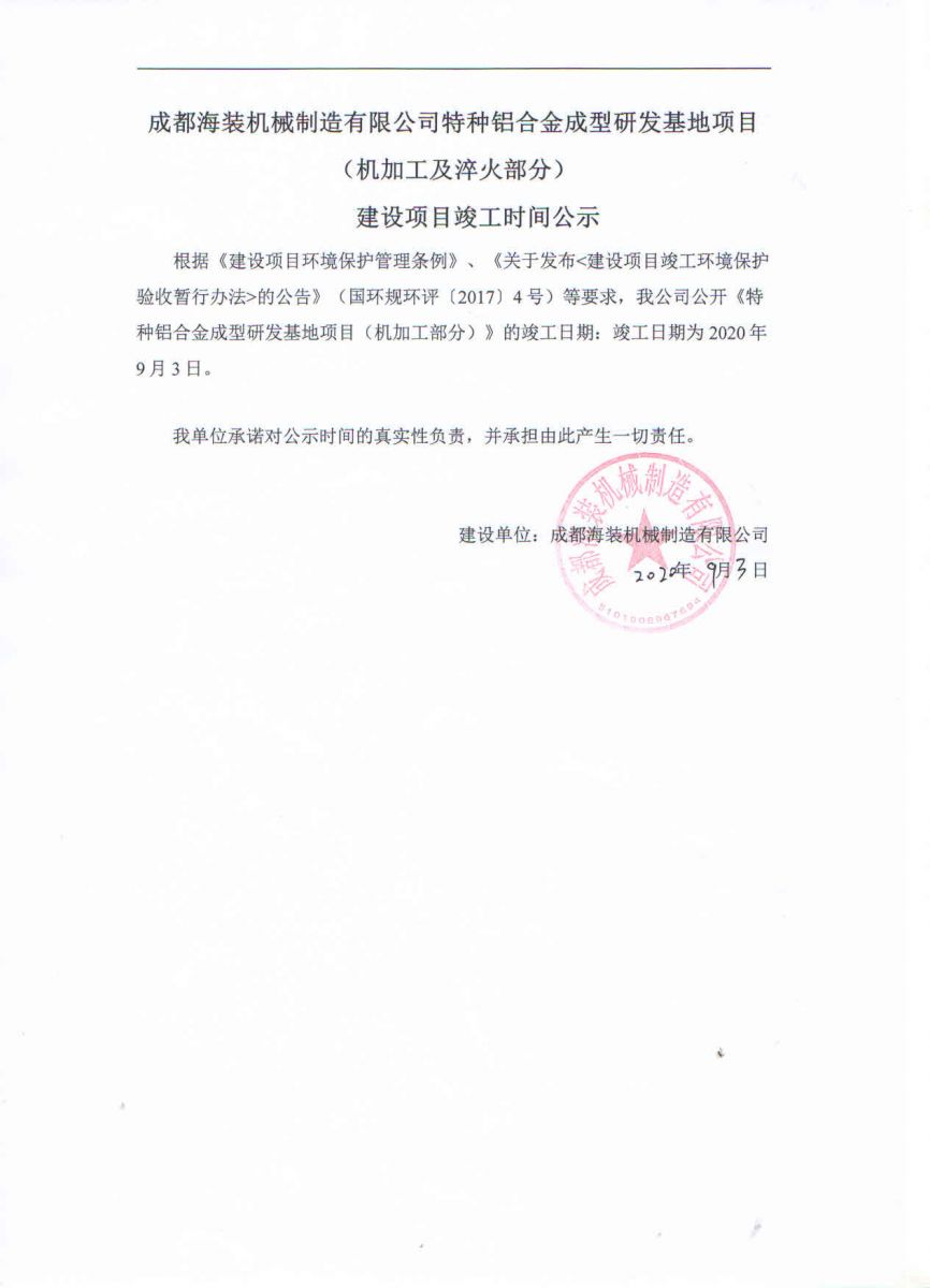 根據(jù)《建設(shè)項(xiàng)目環(huán)境保護(hù)管理?xiàng)l例》、《關(guān)于發(fā)布<建設(shè)項(xiàng)目竣工環(huán)境保護(hù)驗(yàn)收暫行辦法>的公告》(國環(huán)規(guī)環(huán)評〔2017〕4號)等要求,我公司公開《特種鋁合金成型研發(fā)基地項(xiàng)目(機(jī)加工部分)》的竣工日期:竣工日期為2020年9月3日。