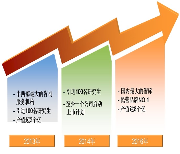本公司是以人才為依托,以市場為導向,致力于打造中國第一流的技術(shù)咨詢團隊。目前已形成員工500余人、產(chǎn)值近2億元、服務資質(zhì)18個、業(yè)務范圍11個省的初步規(guī)模,但技術(shù)力量還比較薄弱,服務范圍還不理想,公司的影響力比較有限。在公司擬在成立十周年之際,緊抓十八屆三中全會所帶來的歷史機遇,苦練內(nèi)功,改革創(chuàng)新,挖掘潛力,用3-5年時間,使公司員工達到1500人、產(chǎn)值達到8-10億元、努力成為中國最有影響的技術(shù)咨詢單位之一。5-10年以后,眾望咨詢業(yè)務將覆蓋全國并走向世界,打造1-2個上市公司,業(yè)務范疇將向技術(shù)研究、創(chuàng)造發(fā)明、企業(yè)設(shè)計、戰(zhàn)略開發(fā)、組織結(jié)構(gòu)、經(jīng)營運作等方面拓展,成為中國的“麥肯錫”……
